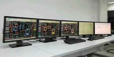 de control La sala de control cuenta con dos lugares de trabajo de operadores con funcionalidades por lotes: uno con cuatro monitores para operar los procesos y otro para monitorizar procesos por lotes (es decir, PFC), editar recetas, acceder a datos, incluyendo realizar cambios en línea a la receta.