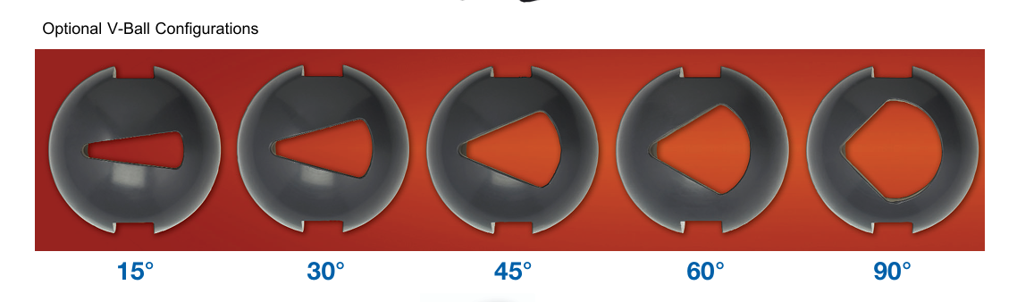 - Bolas en V de 15°, 30°, 45°, 60° y 90°, con puerto completo o de corte lineal.