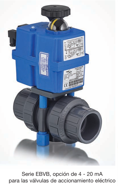- Con control electrónico de accionamiento eléctrico, además del accionador de la serie EBVB con 4 - 20 mA o posicionamiento digital de 0 - 10 VCC. El posicionador digital de modulación ofrece funciones de autoreajuste y autocalibración